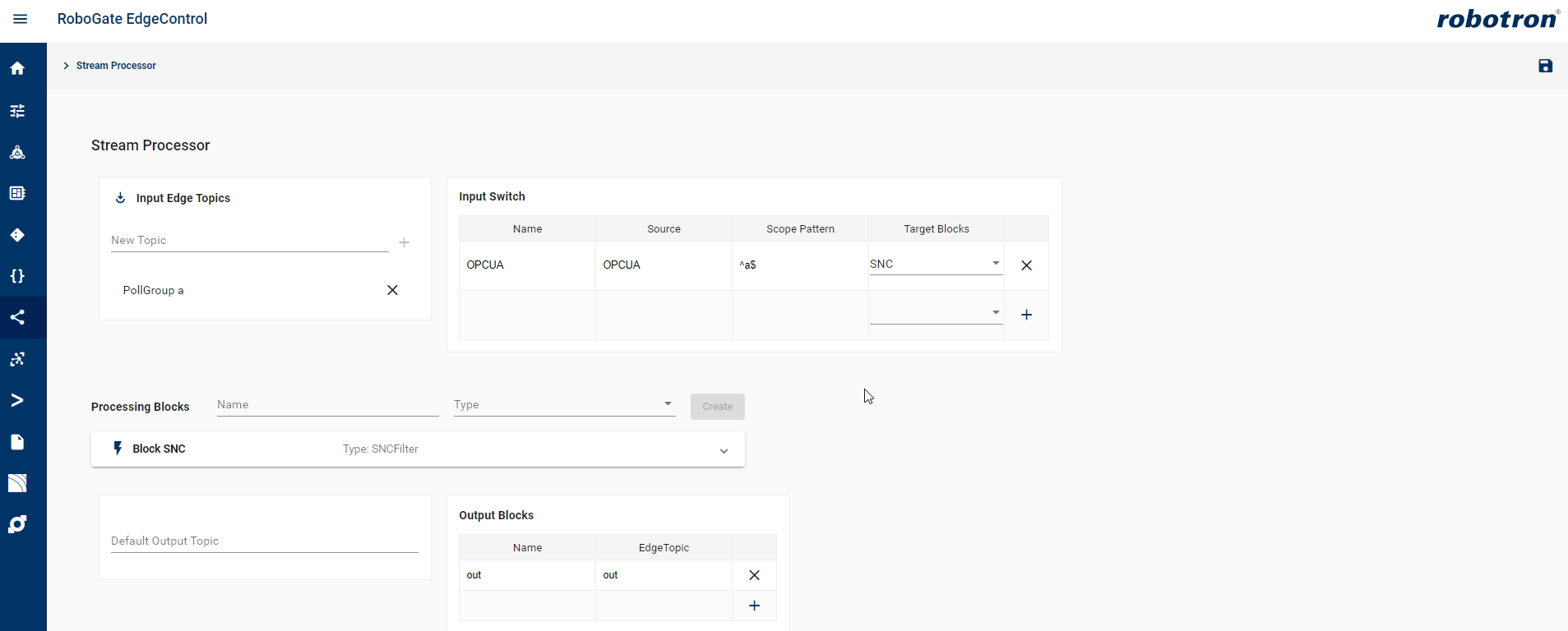 Die angelegte "Pollgroup a" muss nun als Input Edge Topic im Stream Processor angelegt werden. Anschließend müssen die erläuterten Parameter für den Input Switch definiert werden. Im Beispiel werden die Nachrichten im Input Switch nach Source ("OPCUA") und Scope ("^a$") weitergefiltert und dem Verarbeitungsblock "ExpressionEvaluator" zugewiesen (Abbildung 2).