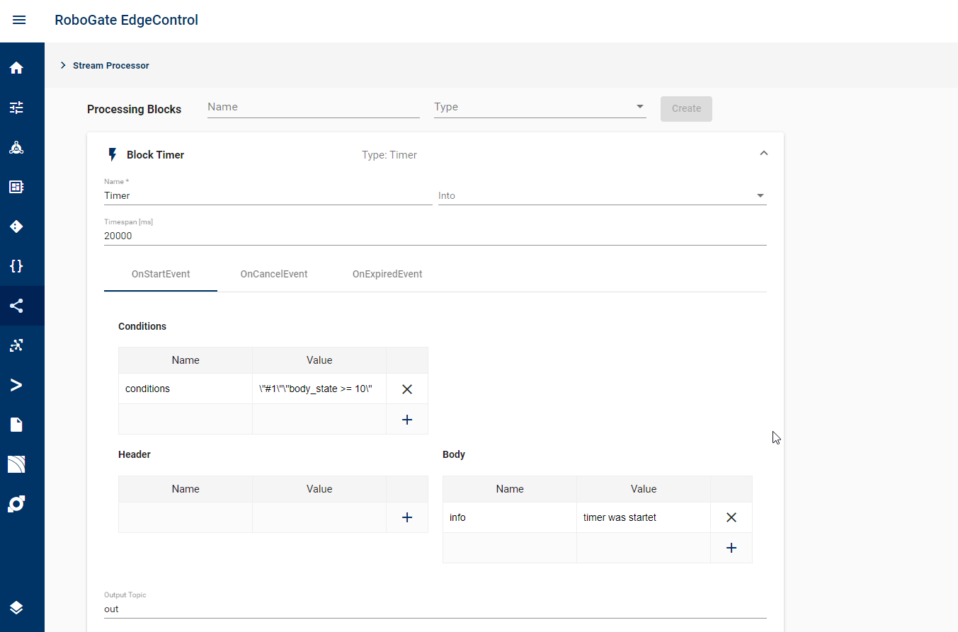 Die in den Processing Blocks definierten Output Topics müssen über die Auflistung in "Output Blocks" an den EdgeGateway Broker zurückgegeben werden, um diese in weiteren Modulen zu verarbeiten.