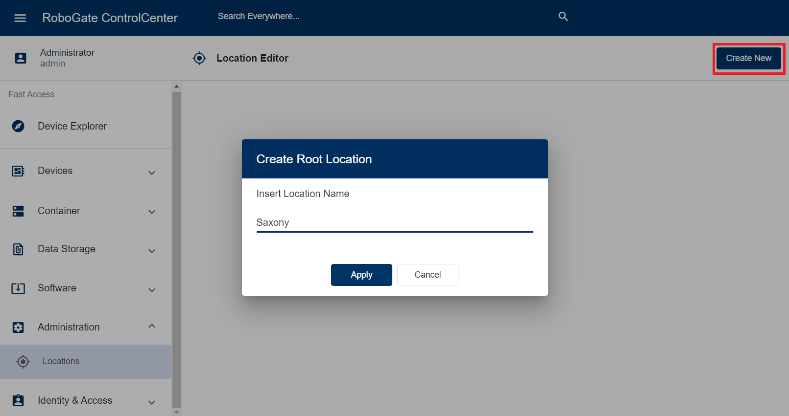 In der Baumstruktur lässt sich zwischen übergeordneten und untergeordneten Standorten unterscheiden. Um einen übergeordneten Standort zu erstellen, klicken Sie auf "Create New" in der Menüleiste (Abbildung 4). Nachdem Sie den gewünschten Namen eingegeben und auf "Apply" geklickt haben, wird der Standort erstellt und im Location Editor aufgeführt. Dem Standort wird hierbei eine Location ID zugewiesen.