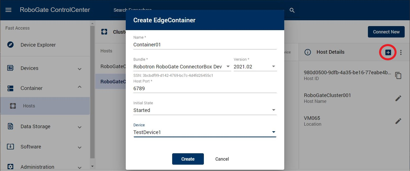 Wählen Sie zunächst den Host in der Host-Liste aus. Klicken Sie dann auf die Schaltfläche "+" in der Menüleiste der "Host-Details" (Abbildung 3). Legen Sie einen Namen fest, wählen Sie die gewünschte Version der Software aus und stellen Sie den Host-Port ein, an dem die Web-Oberfläche lokal verfügbar sein soll. Außerdem kann der Start des Containers nach der Erstellung durch Ändern des „Initial State“ definiert werden. Standardmäßig wird der Container gestartet. Es wird empfohlen, ein Device zuzuweisen, indem Sie es in der Dropdown-Liste "Device" auswählen.