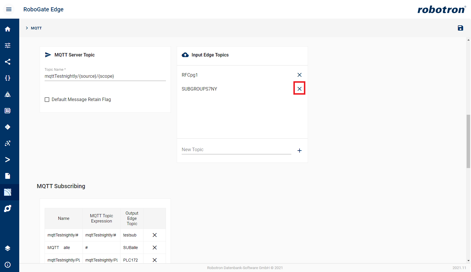 Das RoboGate Edge hat die Möglichkeit, Nachrichten von einem MQTT Broker zu abonnieren. Einer MQTT Topic Expression (Quelle) kann ein Output Edge Topic (Ziel) zugewiesen werden. Von dort aus sind die Nachrichten für andere Module zugreifbar. Die Topic Expression ist nach MQTT-Spezifikation einzutragen.