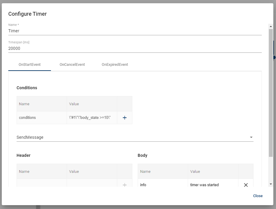 Der Zugriff auf die Nachrichten Properties der Timer Start Nachricht über body_<BODY_KEY> und header_<HEADER_KEY> ist ebenso wie in den Blöcken RuleEngine und Router möglich.
